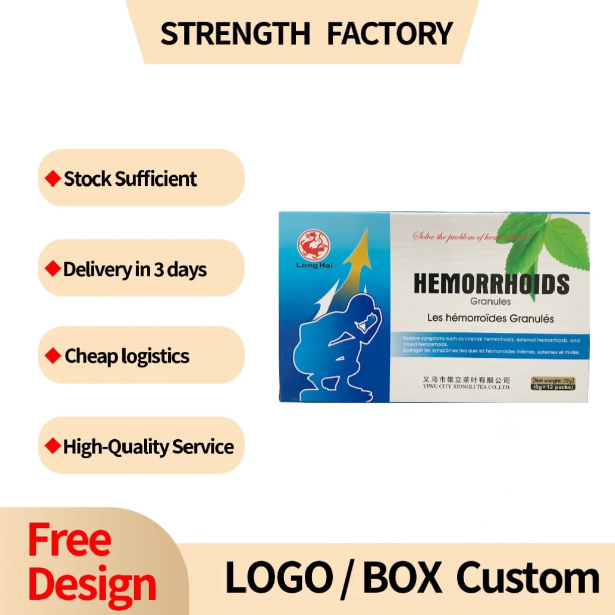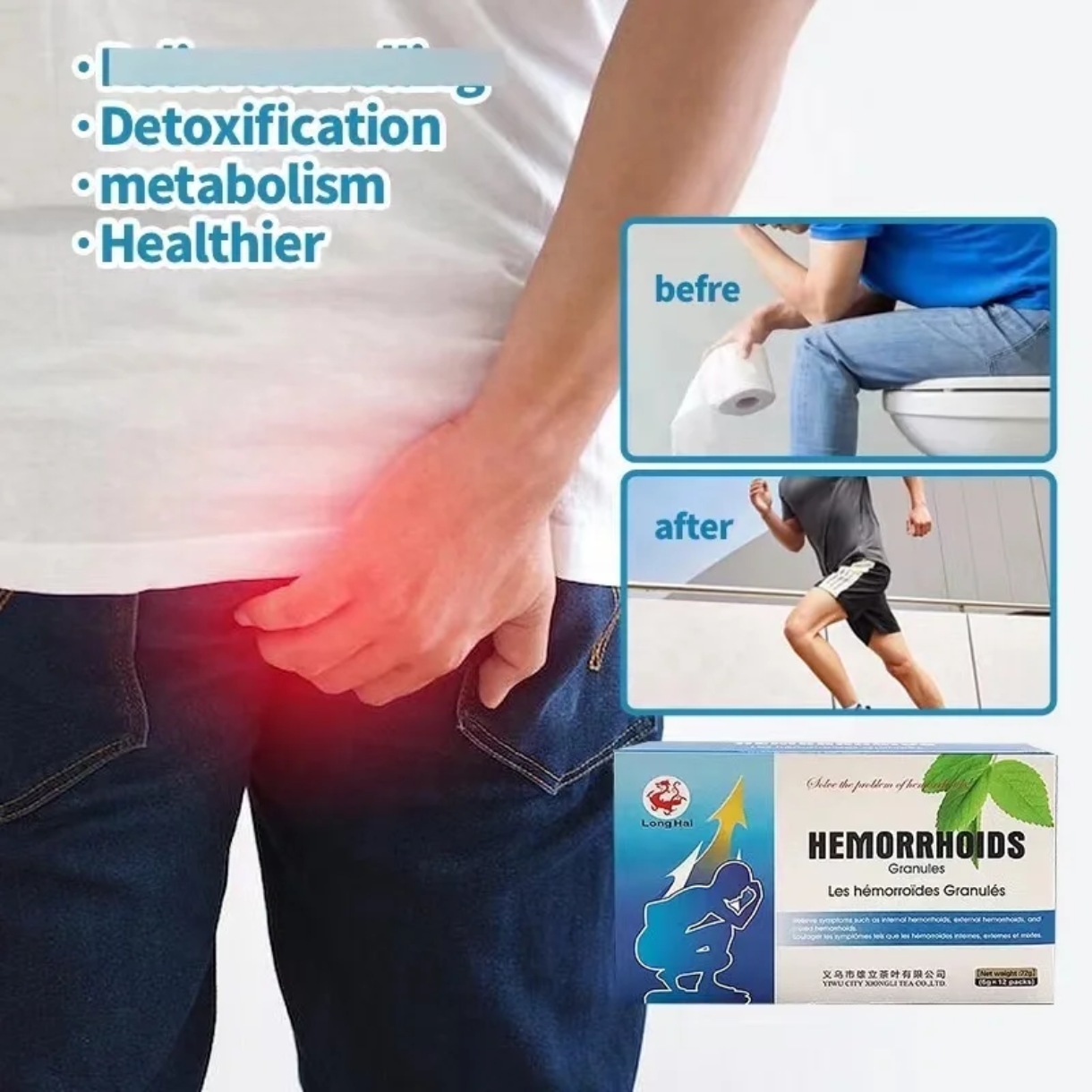 ANTI-HEMORROIDES, produit granulés Long Hai Conçu pour soulager les symptômes associés aux hémorroïdes internes, externes et mixtes.