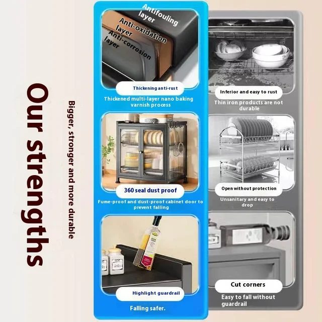 Armoire de cuisine en métal moderne, armoire de rangement anti-poussière, armoire à vaisselle avec égouttoir, armoire de rangement pour vaisselle de comptoir