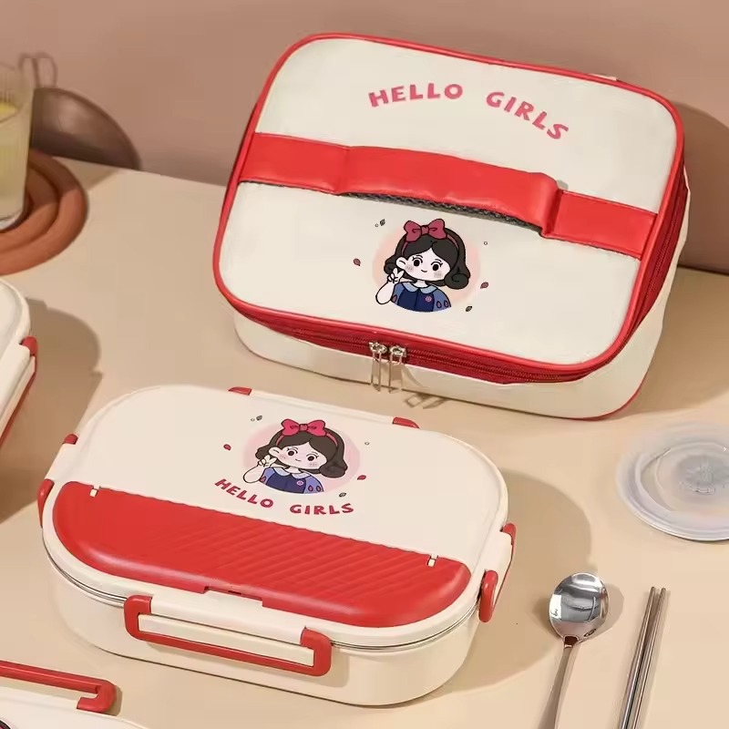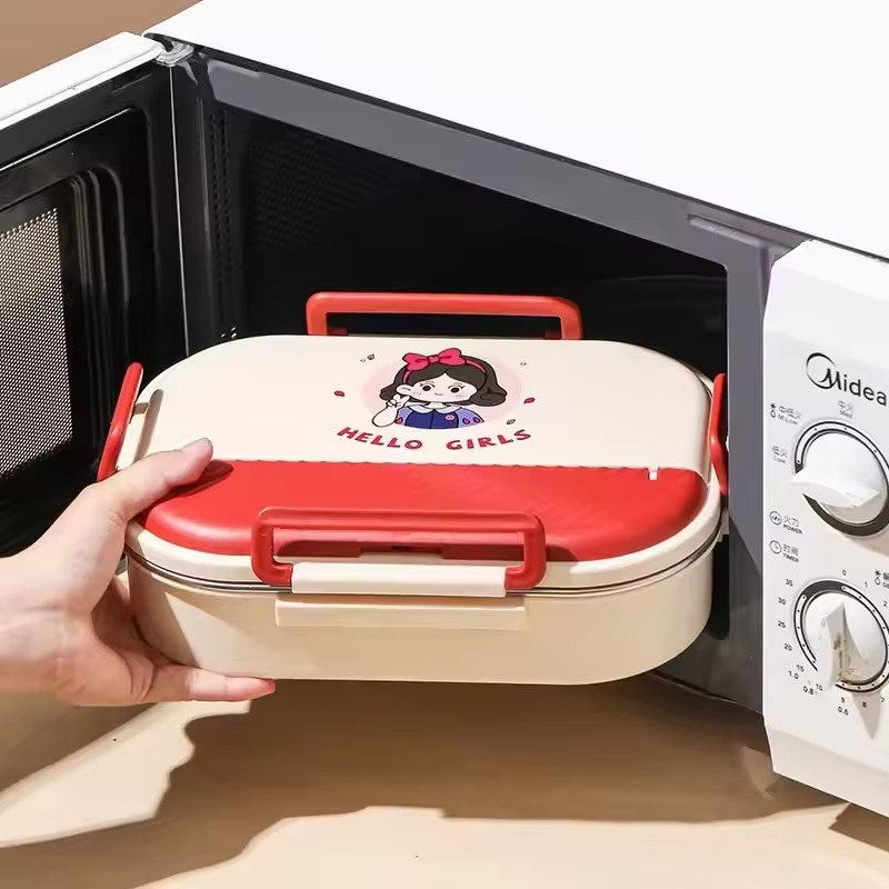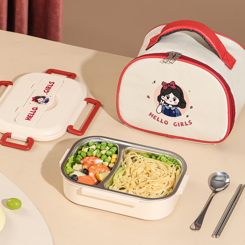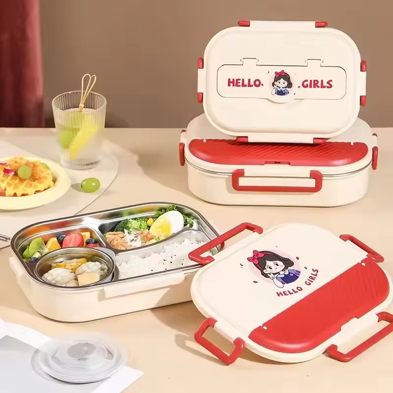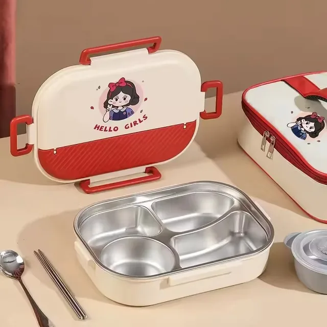 Boîte à déjeuné isotherme en acier inoxydable 304 de 4 compartiments, compatible au micro-ondes, avec couverts.