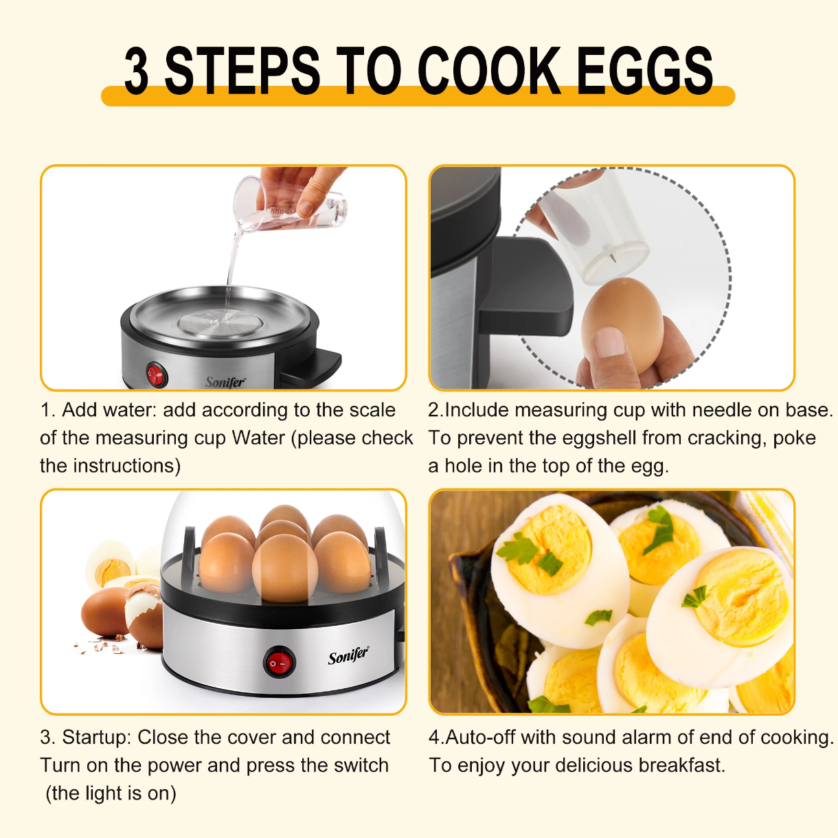 - Faites bouillir jusqu’à 7 œufs simultanément et sélectionnez le degré de cuisson en fonction de l’eau ajoutée