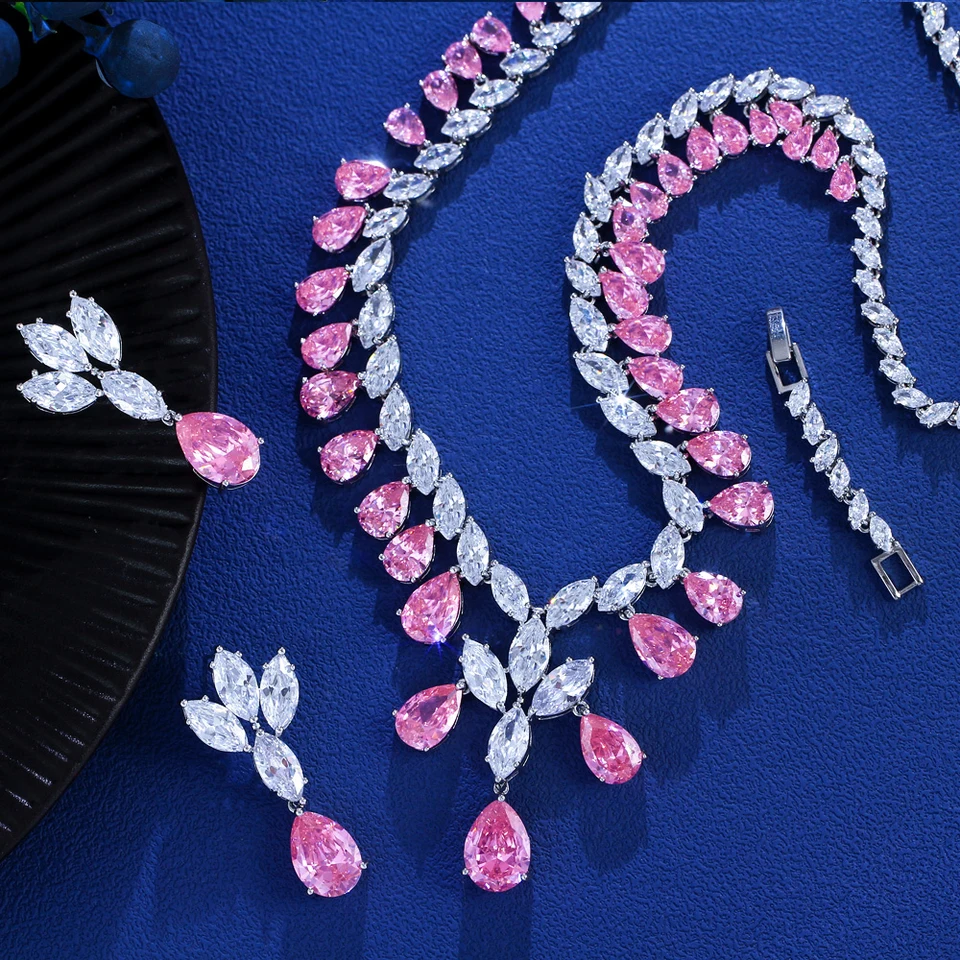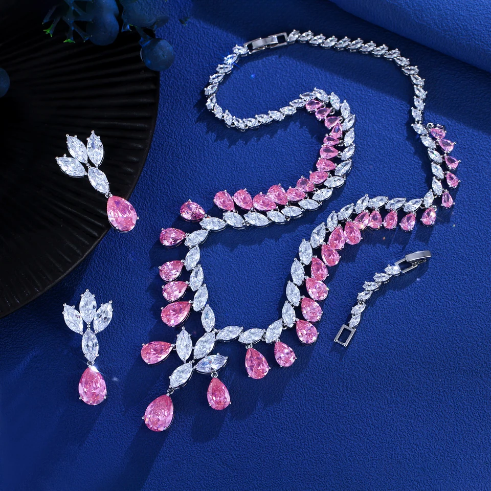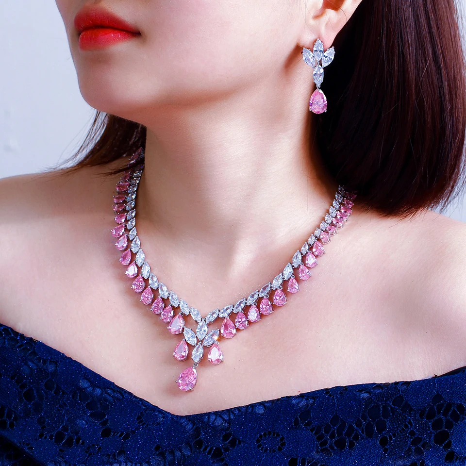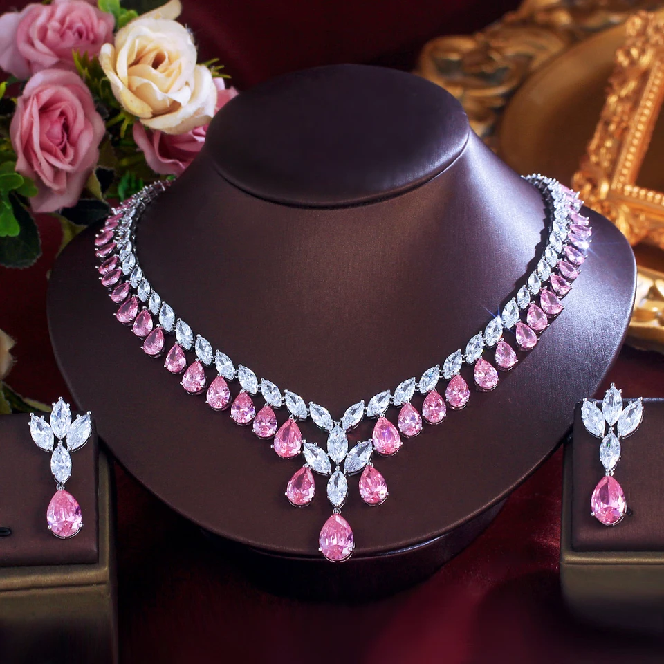 Ensemble de bijoux de mariage de luxe en forme de goutte d’eau Ensemble de collier et boucles d’oreilles en zircone cubique blanc; rose.