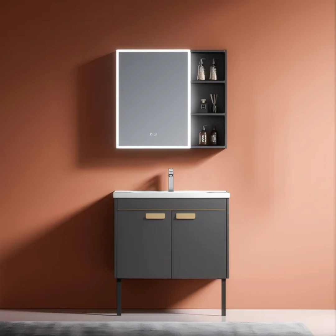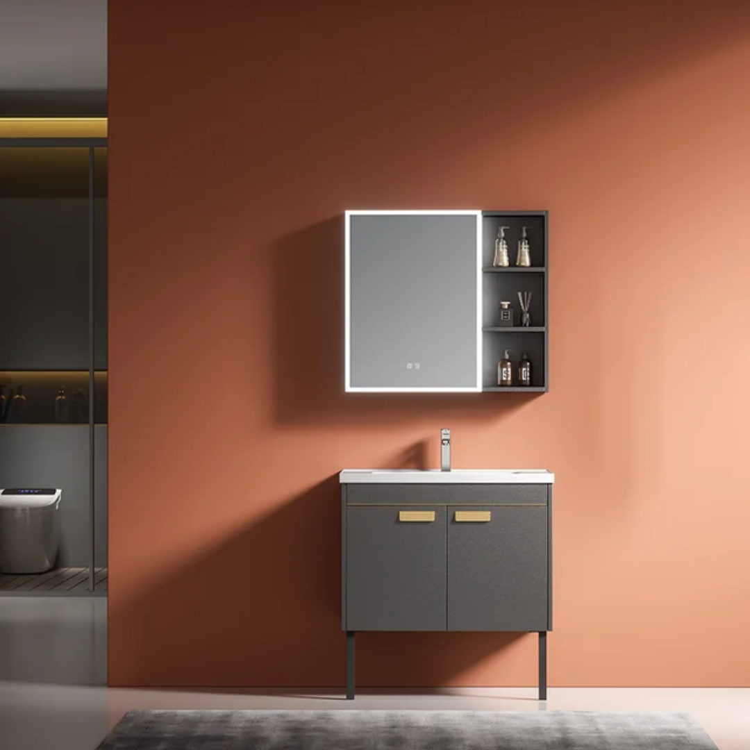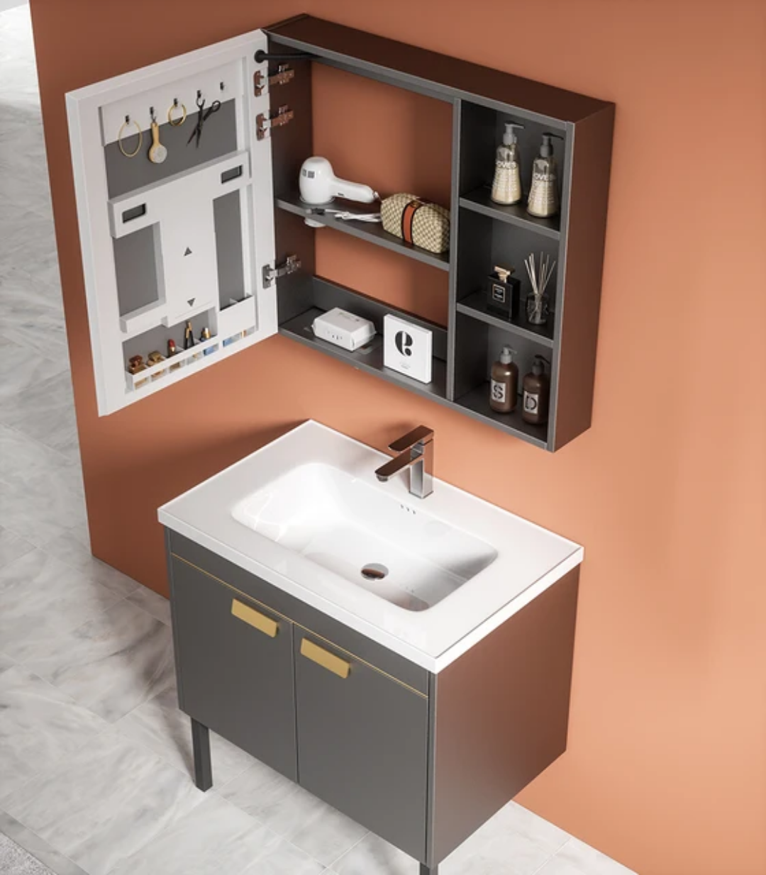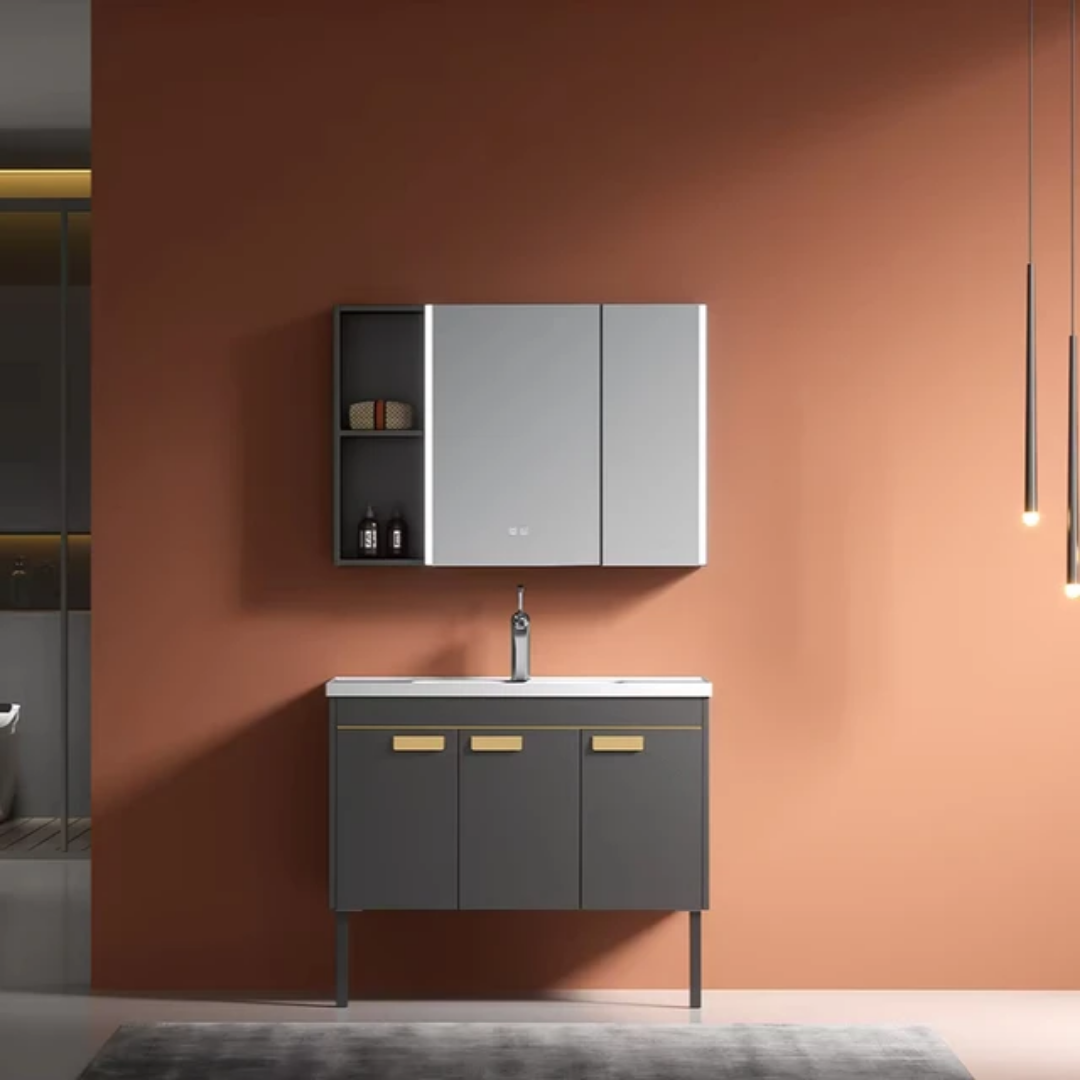 Meuble de salle de bain moderne minimaliste et luxueux. Simple et épuré. Les articles de toilette sont propres et confortables.