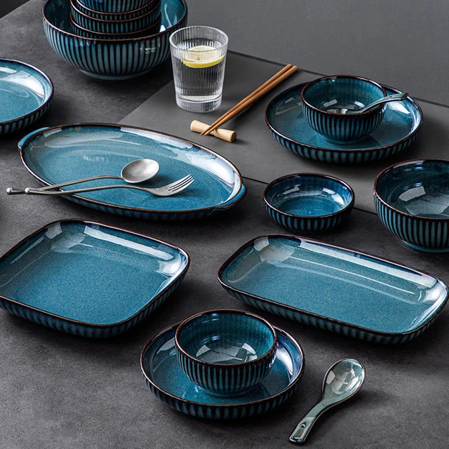 Service de table en porcelaine bleue de haute qualité de 16 pièces en gros Style nordique Europe plats et assiettes de luxe en grès pour restaurant.