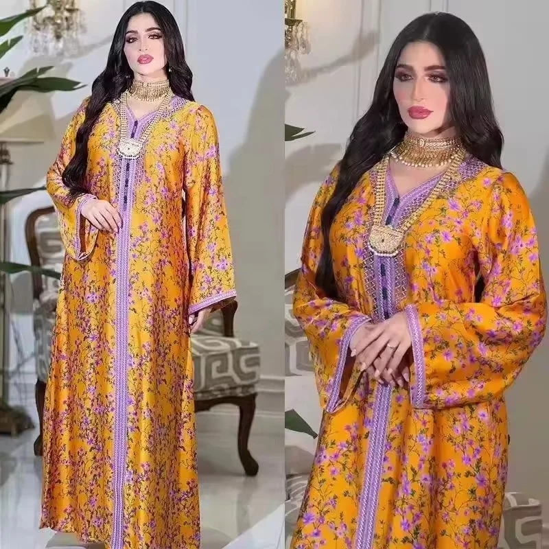 Robe en mousseline de soie de couleur unie à manches longues et col rond avec ceinture. Femme musulmane robe vêtements.